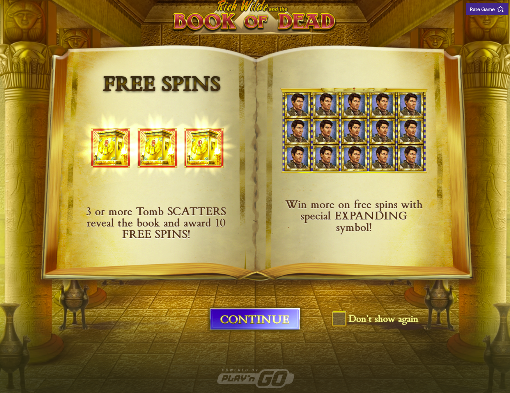 This is a classic 5x3 slot with 10 paylines. The Book symbol acts as both the scatter and the wild. Landing three or more books anywhere on the reels triggers the game's main event. Before the free spins begin, one regular paying symbol is randomly chosen to become a special expanding symbol for the duration of the bonus round.
